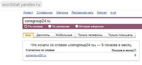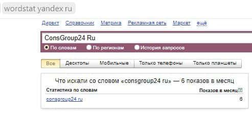 А вот по бренду "ConsGroup24 Ru" количество запросов ничтожно мало, всего 6 раз за месяц.
