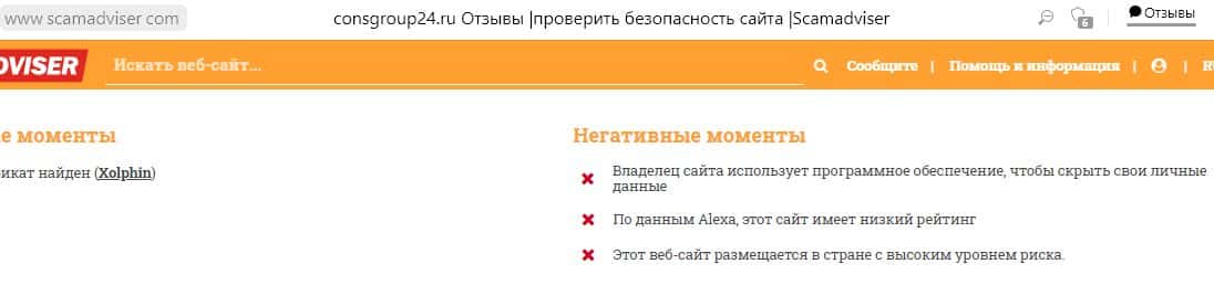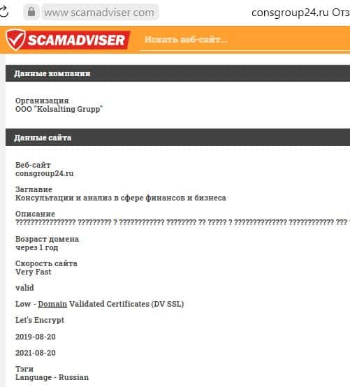 Сайт Scamadviser обращает внимание на опасные моменты, которые свидетельствуют о шулерской деятельности шарашки Консалтинг Групп.