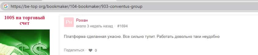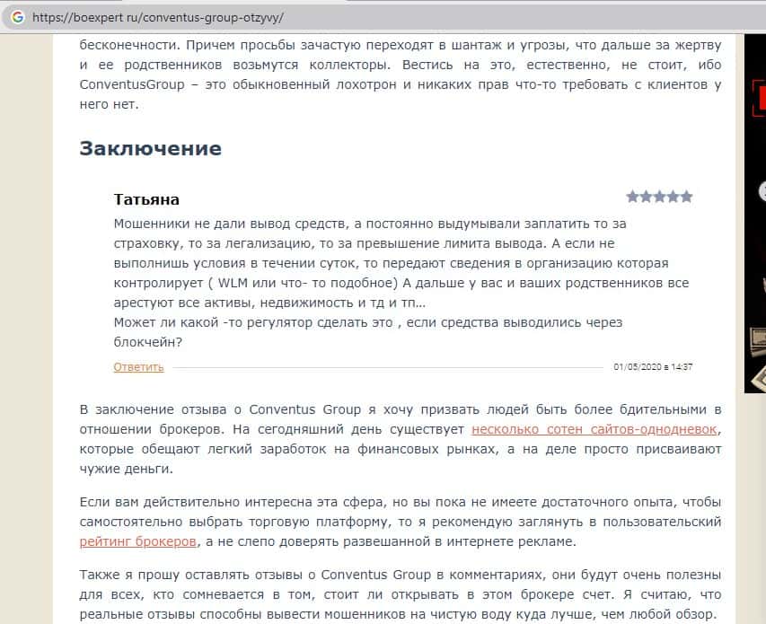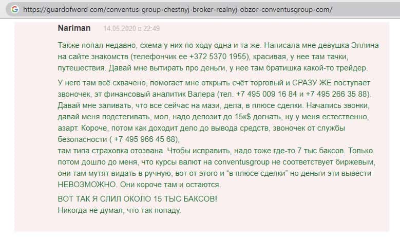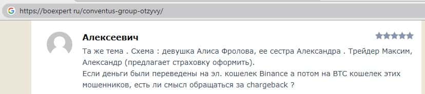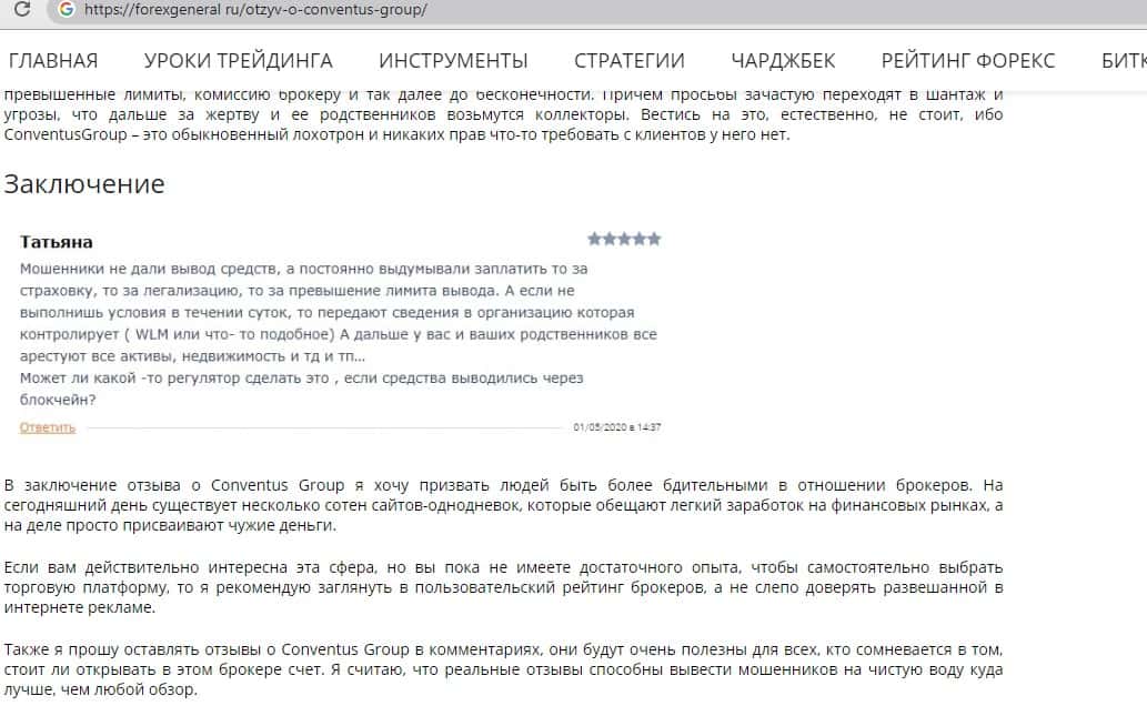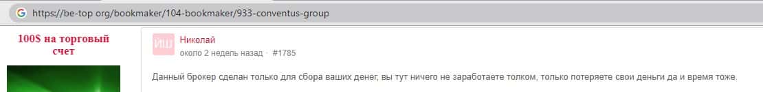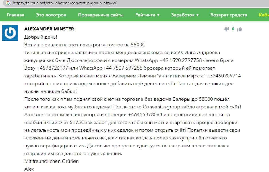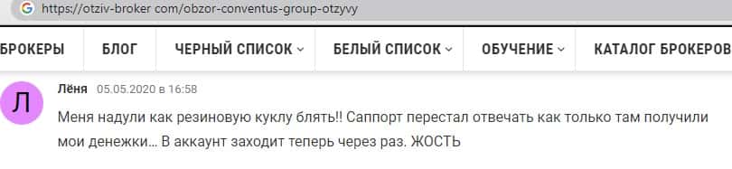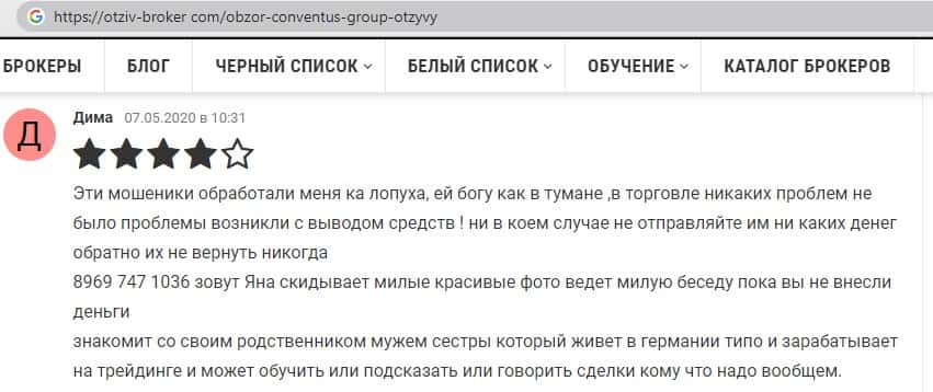 - Также комментарий трейдера который попался на удочку аферистов ConventusGroup