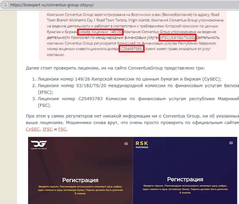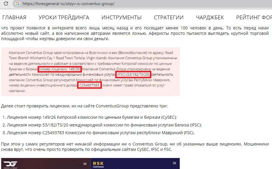 Далее представлена информация о лохотроне Конвентус Групп, где указывается, что он оказался в черном списке кипрского финансового регулятора CySEC, так как не имеет лицензии.