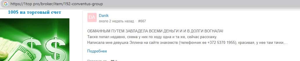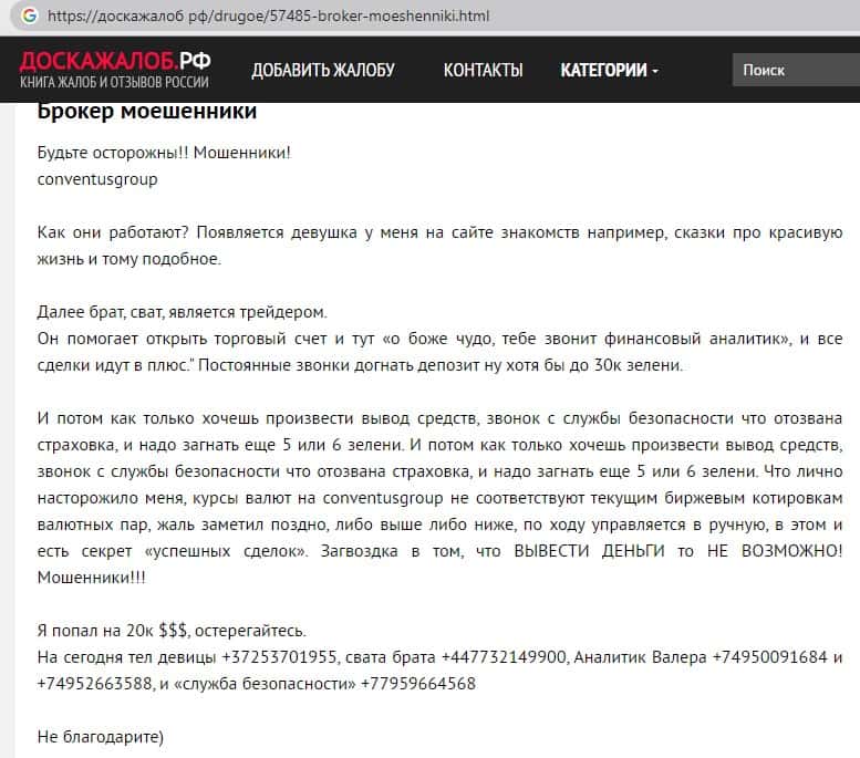 - Негативный опыт одного из брокеров после сотрудничества с аферистами ConventusGroup