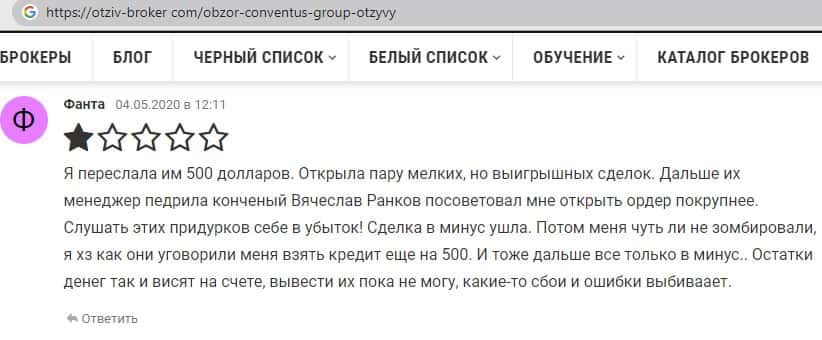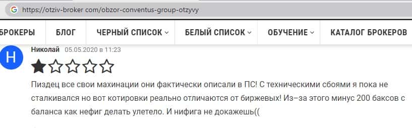 Похвастаться своей не ординарностью наверное не сможет ни кто на финансовом рынке кроме подвального сайта ConventusGroup, так как данный вид развода людей на деньги довольно специфический для брокеров работающих на финансовых рынках и зарабатывающих на мошенничестве, пример негативного комментария можете увидеть ниже.