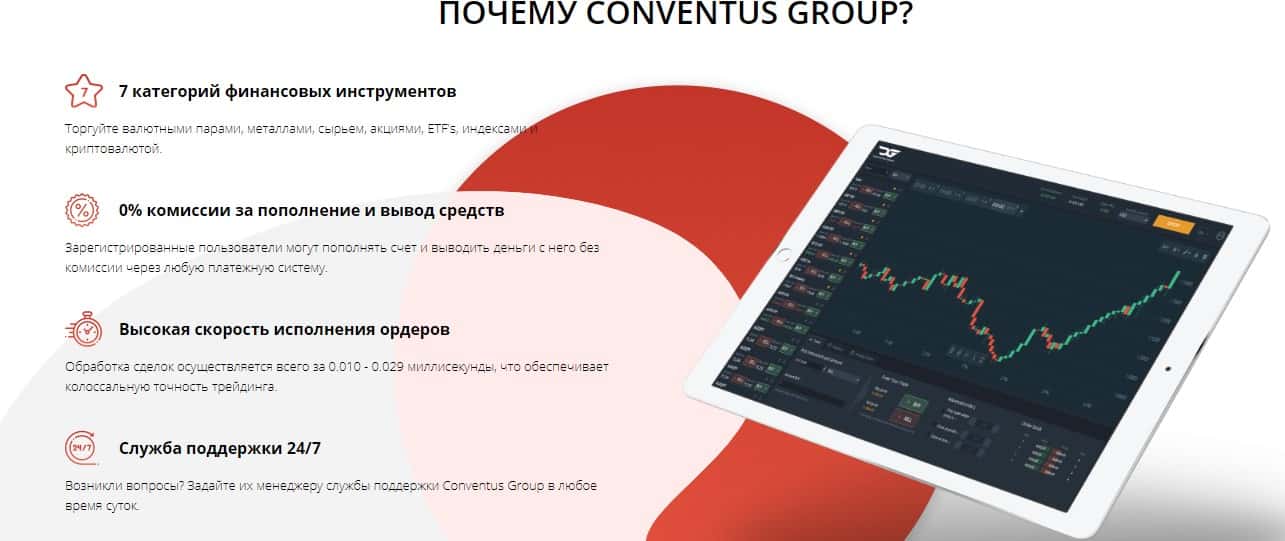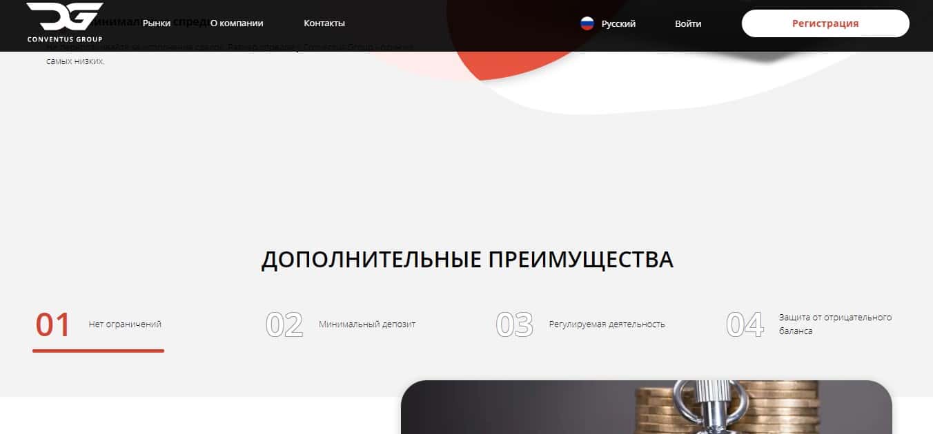Куча фальшивых преимуществ которых нигде нет кроме как только на главной странице сайта аферистов Конвентус Групп которые представлены в виде напечатанных букв. Все остальное не имеет смысла. Главное не доверяйте мошенникам ConventusGroup свои инвестиции и не видитесь на их хитрые уловки.