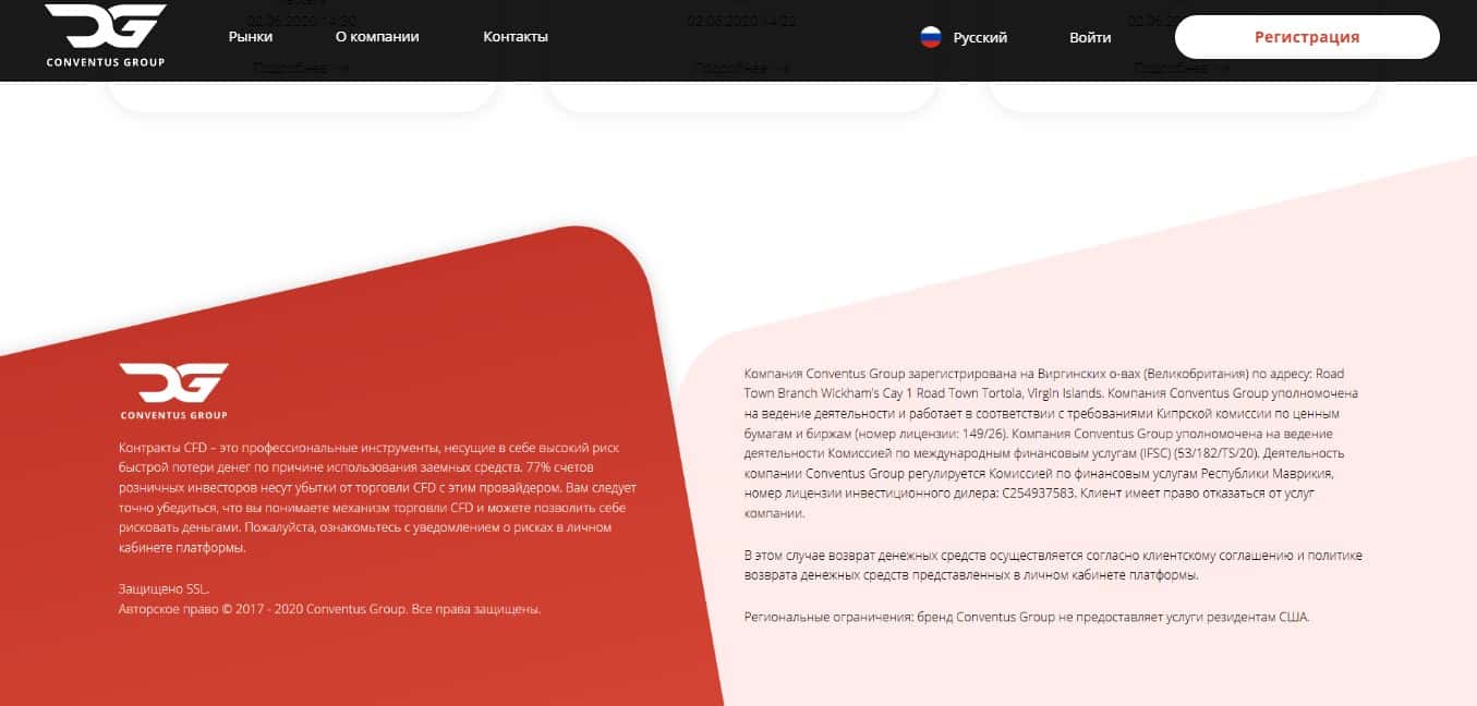 Conventus Group это самый настоящий лжеброкер, который на самом деле представляет собой банальную кухню. Как бы там ни было, репутация у компании очень плохая, кроме того, она предлагает торговлю контрактами на разницу, крайне рискованным инструментом, который в 99 случаев из 100 приводит к финансовым потерям со стороны клиента.