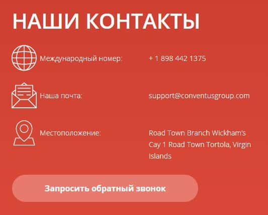 Для своих контактов подвальный сайт ConventusGroup отвёл отдельный раздел на своём ресурсе, но это ни коем образом не влияет на их честность перед трейдерами, так как все контакты вымышлены и сделаны для отвода глаз. Таким образом фальшивые контакты мошенников Конвентус Групп вы можете увидеть ниже: