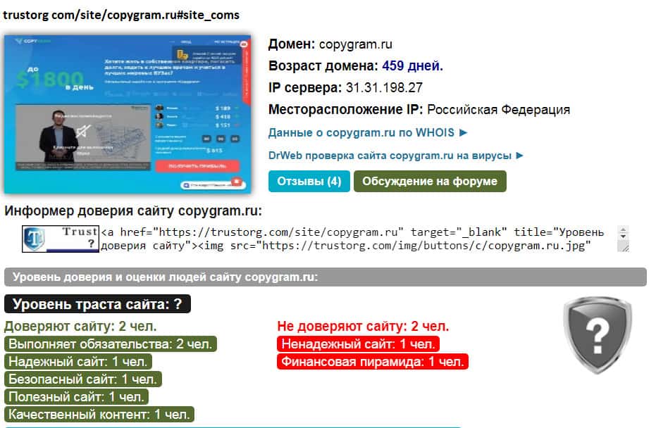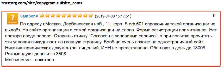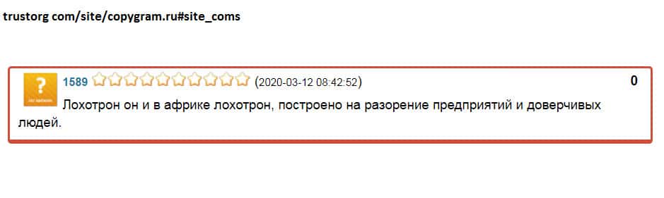 - Очень низкий уровень доверия к шараге CopyGram Ru у пользователей сети!