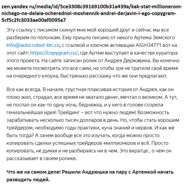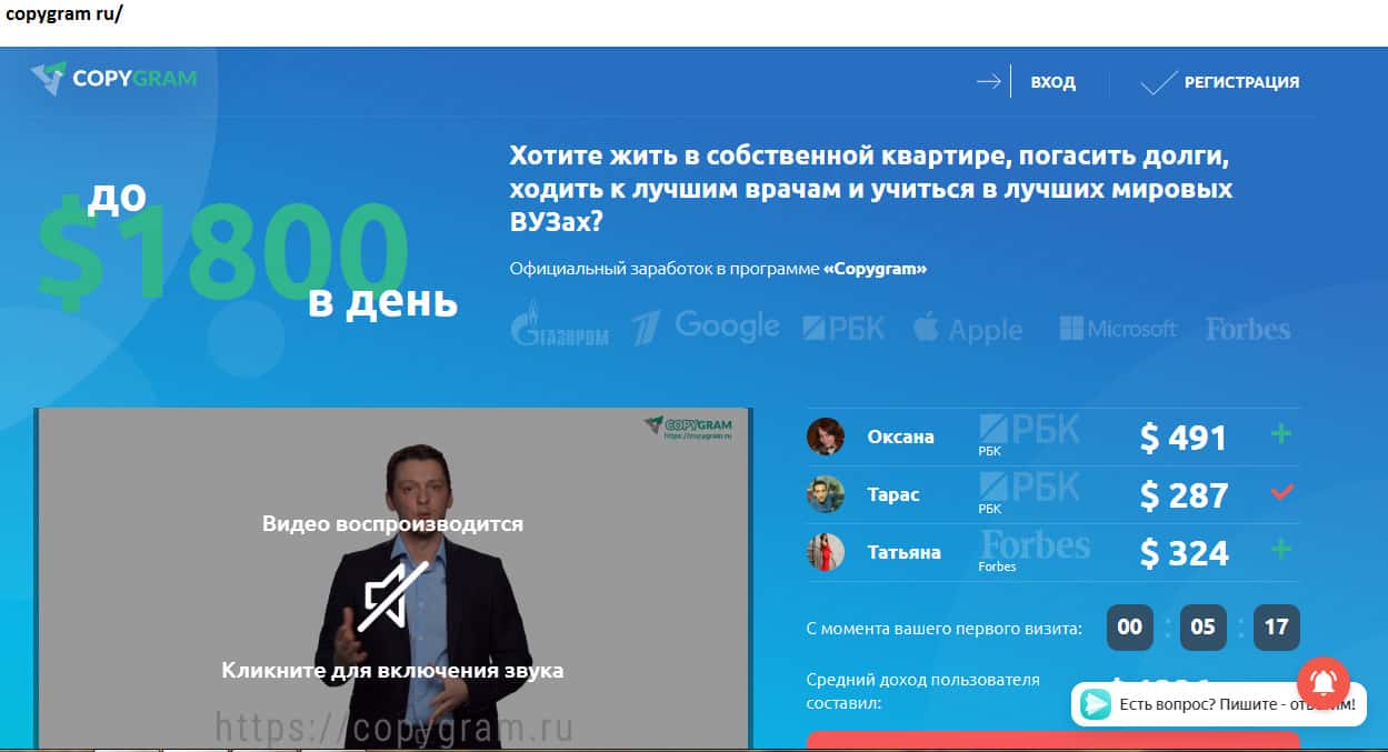 На официальном сайте мошенников представлено видеообращения создателя идеи Копи Грам. Некий Андрей Державин рассказывает душещипательную историю, в которую с трудом поверит адекватный пользователь! Дешевый сценарий, по которому развивались события, явно пахнет заказухой. Аферисты Копи Грам заявляют, что с ними миллионером может стать каждый!