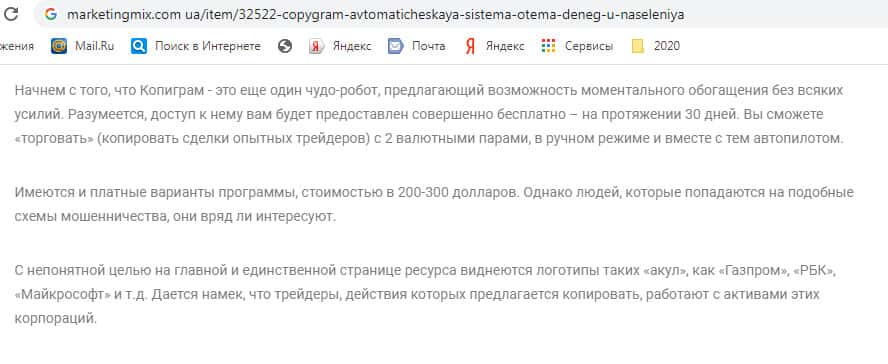 CopyGram Ru - это очередной лохотрон, по продаже автоматизированного помощника для трейдеров. Жаждущие быстро разбогатеть, лежа на диване, ведутся на невообразимые сказки от лоховодов CopyGram Ru. Шаражкина контора предлагает пользователям приобрести у них программу, которая копирует сделки успешных трейдеров. Разводняк рассчитан на лопухов!!!