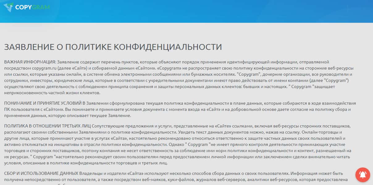 Политика конфиденциальности создана для того, что бы клиент мог спокойно оставить на сайте свои персональные данные! Но это не в случае с жуликами CopyGram Ru! Несмотря на то, что политика якобы есть, по юридической силы она не имеет. Это сделано для отвода глаз! Ваши персональные данные жулики CopyGram Ru могут передавать третьим лицам за деньги!