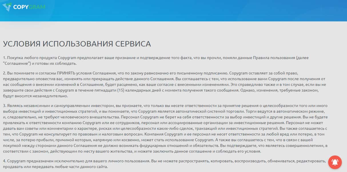 Удивительно, но мошенники Копи Грам решили предоставить на рассмотрение трейдеров пользовательское соглашение! Такой ход конечно интересный, сделан он с целью замылить глаза клиентов! Потому что все мы понимаем, что такого рода документы абсолютная фикция, если к ним не прилагается лицензия от Центрального Банка РФ! А ее у мошенников точно нет!!!