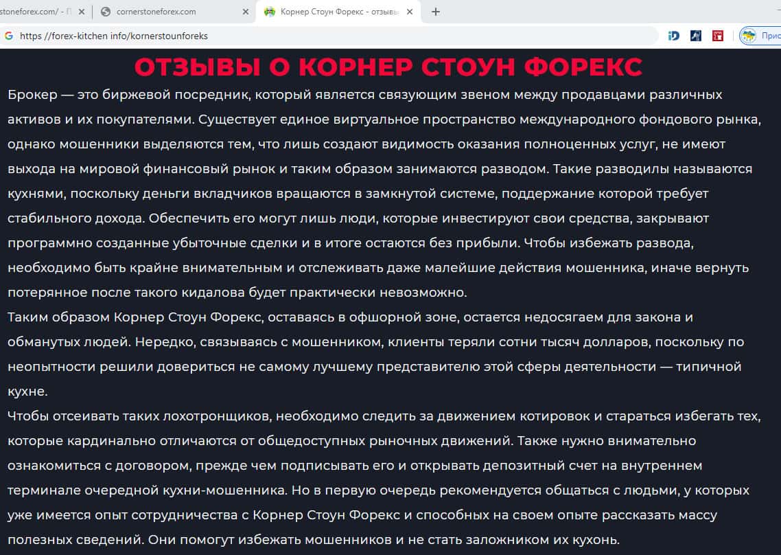 На скриншоте, расположенном ниже, Вы можете ознакомиться с информацией по поводу того, что авторитетный интернет-портал предоставляет честный обзор на слившуюся компанию-однодневку Corner Stone Forex, которая на самом деле обанкротилась. Судя по отзыву руководство по-настоящему соскамило веб-сервис и замело за собой все следы.