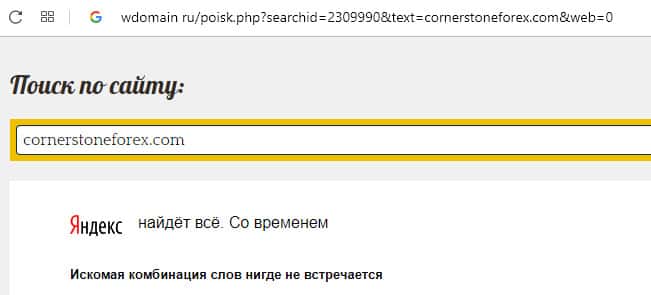 Согласно сведениям, которые нам предоставил уважаемый веб-портал trustorg com, псевдоброкерская организация Корнер Стоун Форекс смогла улизнуть совершенно бесследно и безнаказанно от обманутых пользователей и правоохранительных органов. Судя по нижеуказанному скриншоту нет вообще никаких сведений в сети интернет о портале брокера.