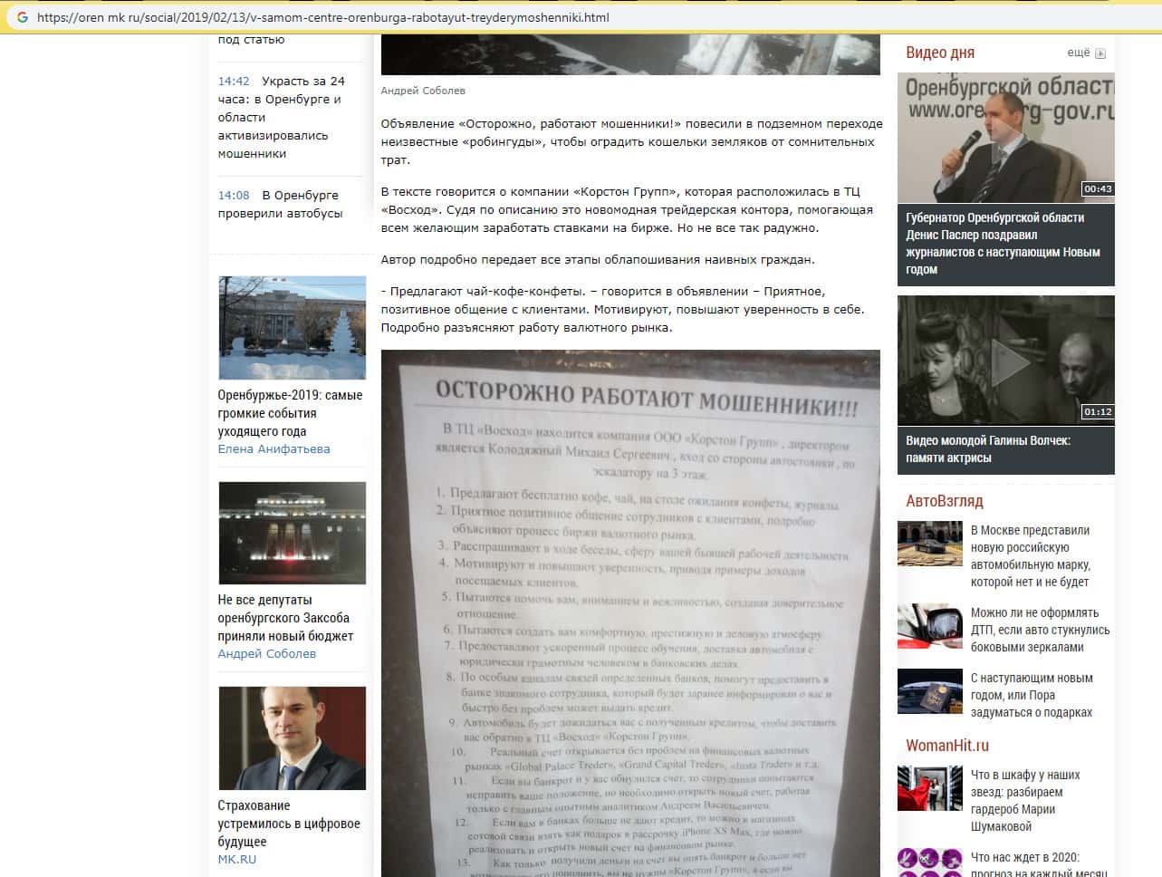 Сайт орен мк ру опубликовал реальный отзыв-статью на своем сайте с предупреждением о подвальной деятельности Korston Group, а именно о том, что когда не срабатывает последняя ставка, трейдеры разводят руками. И отпускают опутанного кредитами клиента восвояси. Кричать и ругаться бесполезно – охрана выводит скандалиста вон и больше никогда не пускает.