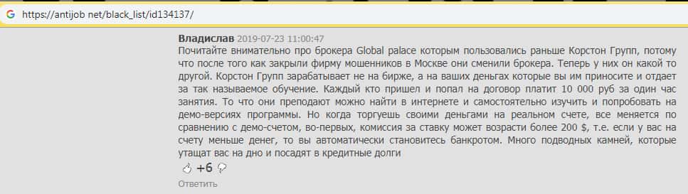 Пользователь Владислав на одной из страниц оставил отзыв о мошенниках Корстон Групп, которые зарабатывают, по его словам, не на бирже, а на деньгах клиентов, которые они им приносят и отдают за так называемое обучение. Он утверждает, что у жуликов Korston Group много подводных камней, которые утащат вас на дно и посадят в кредитные долги.