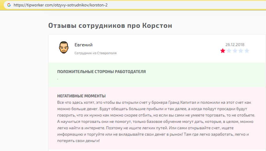 По мнению одного из комментаторов среди сотрудников шараги Корстон Групп о мошенниках Korston Group можно сказать лишь то, что данная организация занимается не честной деятельностью и обманывает своих клиентов. Зачислив деньги на открытый там торговый счет, клиент, конечно, обратно их не получит. Поэтому не рекомендуем сотрудничать с Корстон Групп!