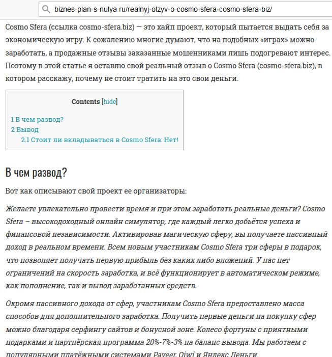 Те реальные мнения с авторитетных источников, которые есть в сети про Cosmo-Sfera Biz однозначны - это обыкновенный хайп. Автор очень четко подметил, что интернет кишит нанятыми шавками, которые пишут позитивные мнения об этой шаражке. Только вот с аргументацией там проблема. И серьезная. Это сразу бросается в глаза.
