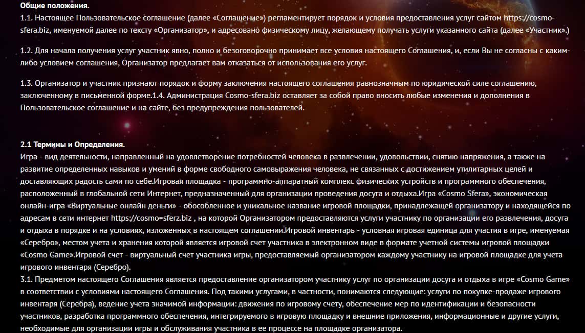 - Описание клиентского соглашения Космо Сфера