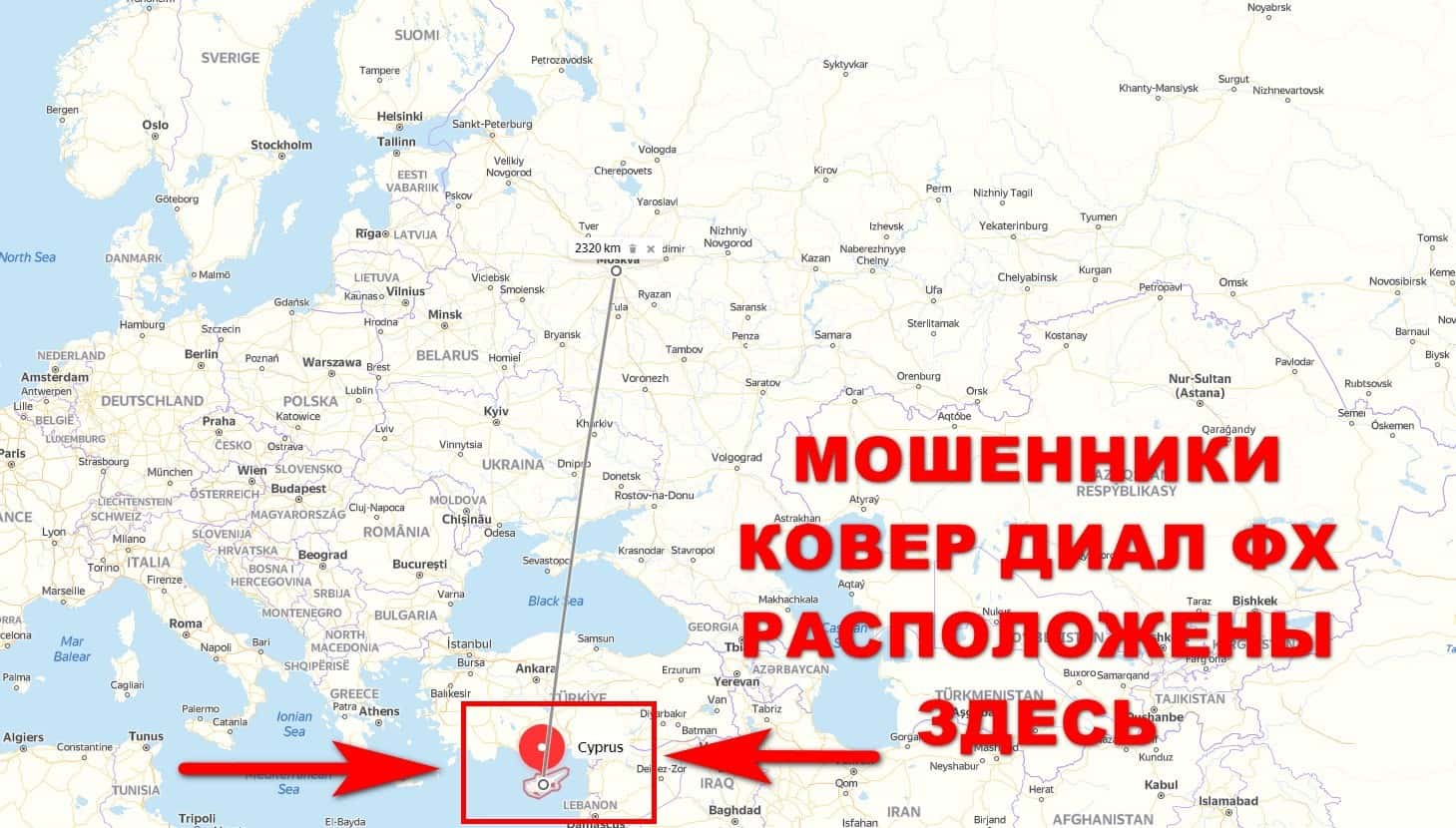 Далее представлена информация о местоположении лохотрона Ковер Диал ФХ. Исходя из официальных данных, мошенники находятся на острове Кипр, что является оффшорной зоной.