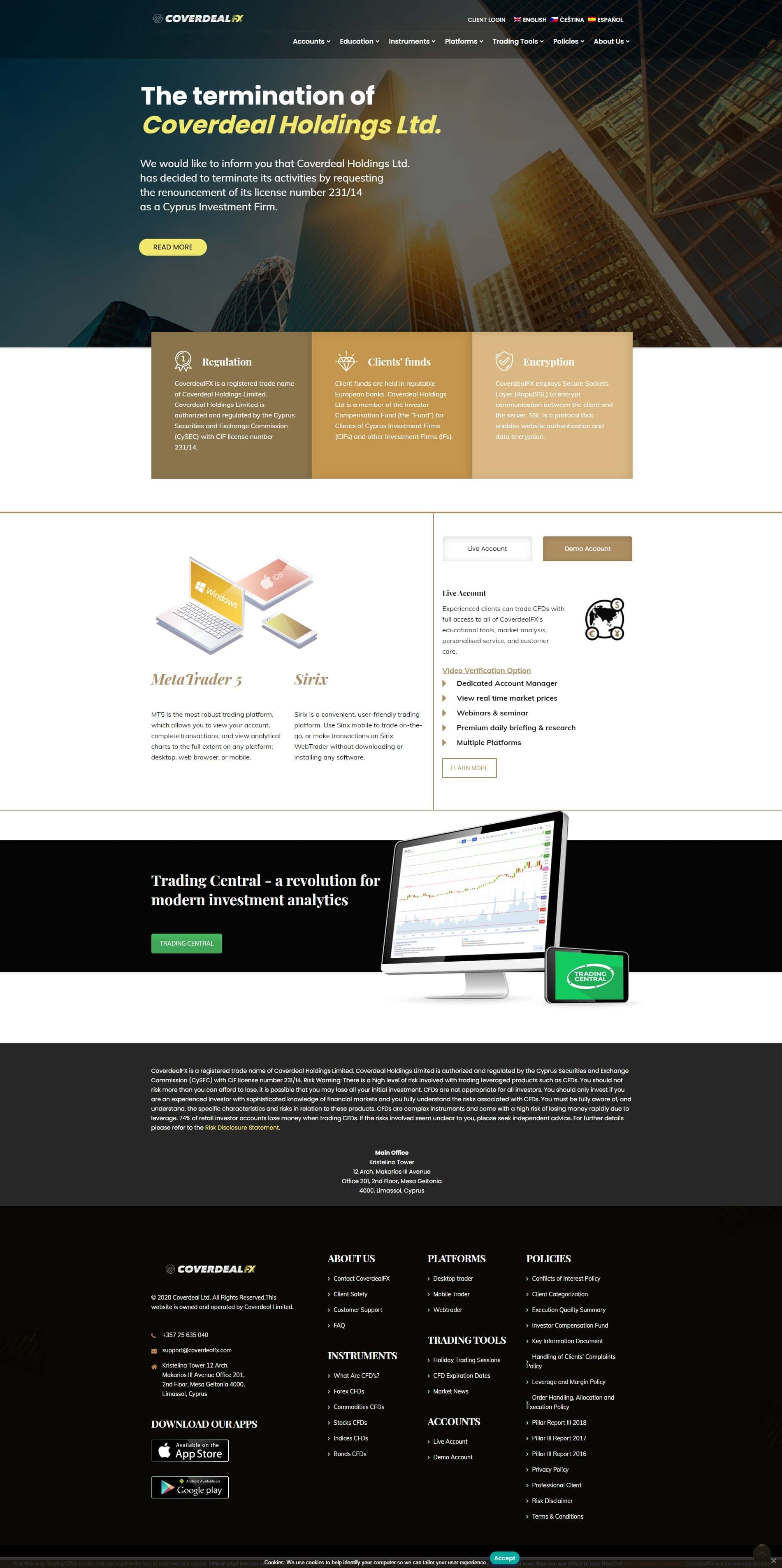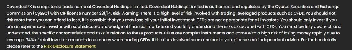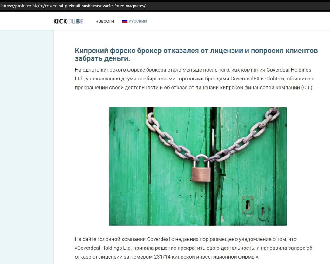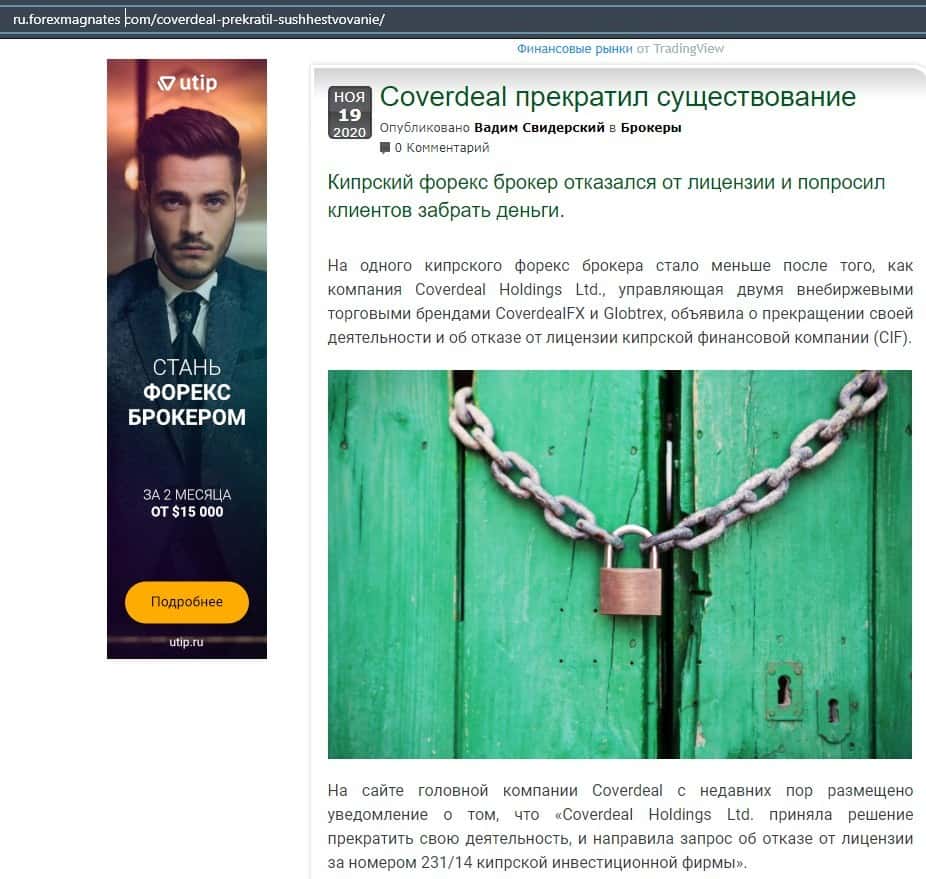 Еще одна статья посвящена предупреждению, что контора CoverDeal FX находится на стадии соскамливания, так как не получила повторную лицензию от кипрского регулятора.