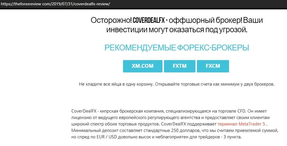 Ниже представлена еще одна статья в которой предупреждается, что контора CoverDeal FX - это оффшорный форекс-брокер, который может присвоить себе все ваши вложенные деньги.