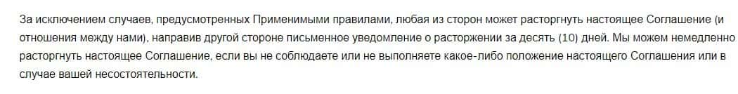 Еще в договоре форекс-лохотрона Ковер Диал ФХ отмечено, что они могут в любой момент расторгнуть договор без каких-либо предварительных уведомлений и конкретны причин.