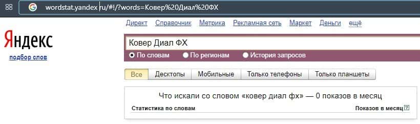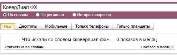 Что касается бренда "КоверДиал ФХ" в другом виде, то здесь также ни одного показа за последний месяц согласно системе Яндекс.Вордстат.