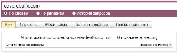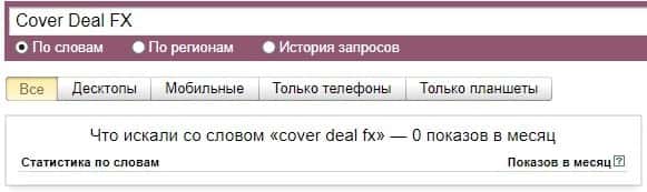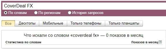 Если рассматривать поиск самого бренда англоязычной версии "CoverDeal FX", то система Яндекс насчитала порядка 0 показов за последнее время.