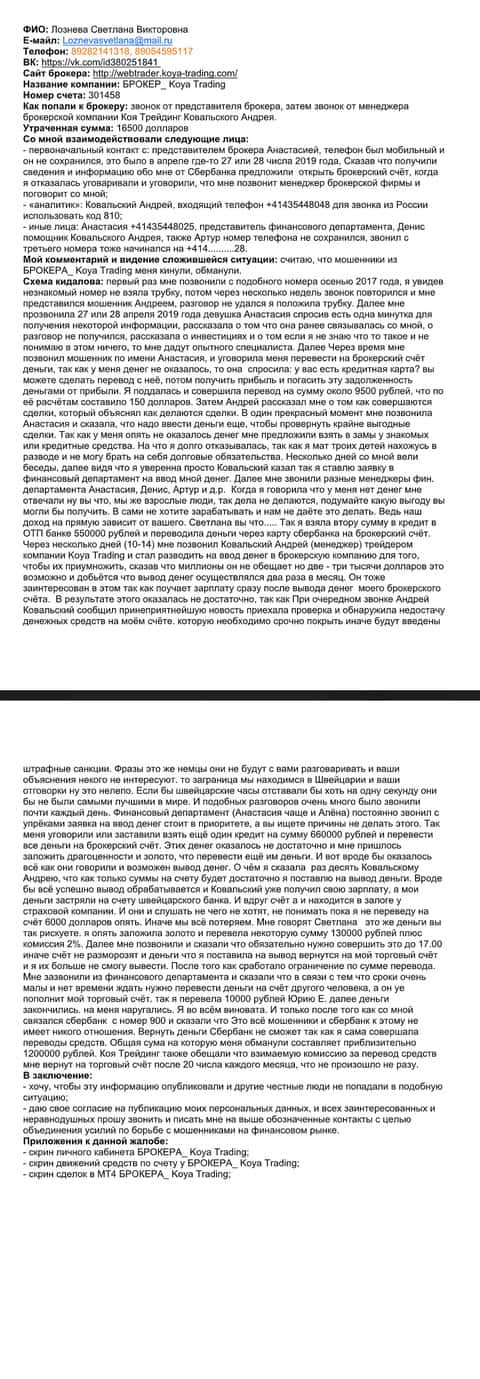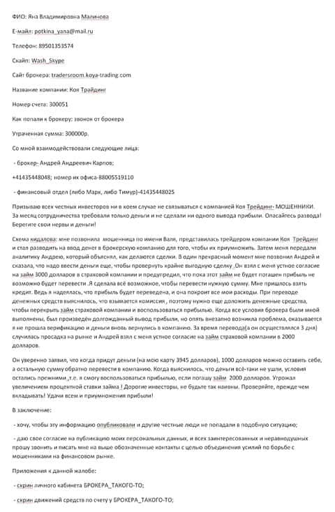 Подробная жалоба на Koya Trading - клиент утратил примерно 5000 $