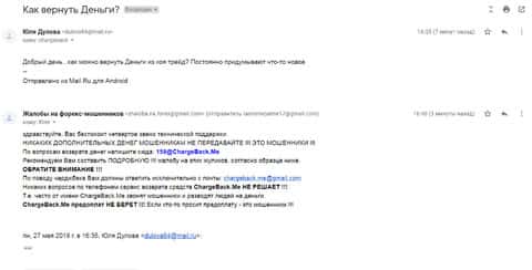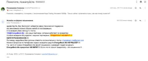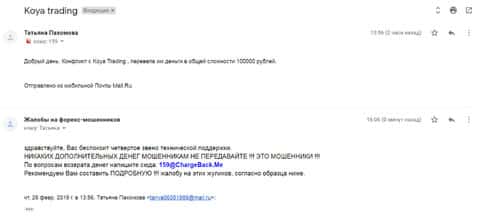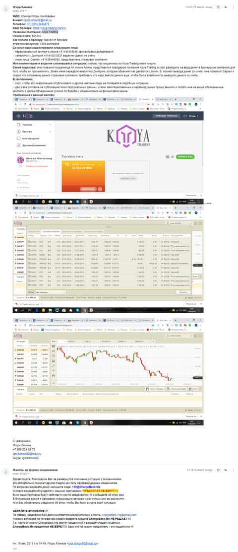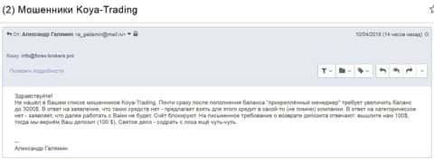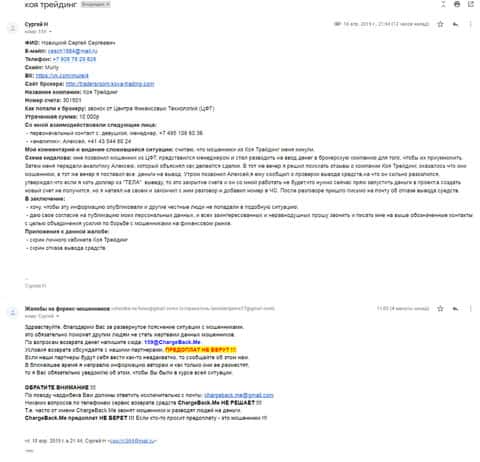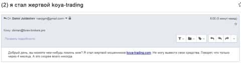 Далее представлена копия письма от человека, который написал в подробности развода со стороны лохотрона Koya-Trading.
