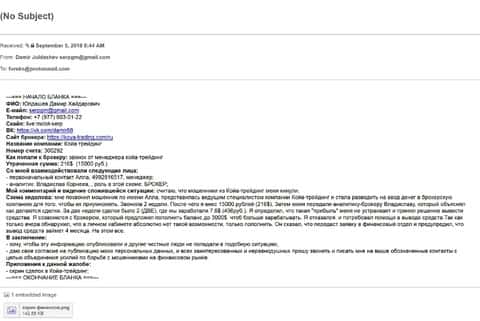 - Подробная жалоба на Коя Трейдин - клиент утратил 10 000 рублей