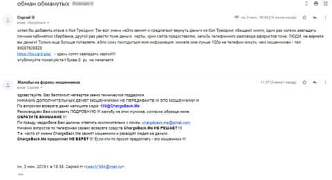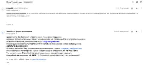 По поводу возврата потерянных денег в мошеннической конторе Коя Трейдинг, автору последующей жалобы на этих явных аферистов нужно обращаться в интернет-сервис ChargeBack.Me за помощью. Именно так ему советуют на данном сайте по сбору жалоб на форекс-мошенников.
