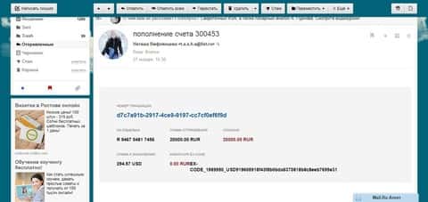 И еще раз представлен скриншот письма от платежной системы AdvCash, которое уведомляет клиента о переводе средств в размере 287,69 долларов на счет жуликов Коя Трейдинг.