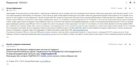 Вся история началась со звонка звонаря, который лестью и обещаниями уговорил женщину вложить денег им на счет. После пополнения аккаунта на 10 000 рублей с ней связался аналитик Алексей, его задачей было вести сделки и в итоге за долгое время он смог заработать аж 2,6 доллара. Мошенник продолжал звонить и упрашивать еще дать денег, но женщина отказалась и он пропал. Спустя некоторое время позвонил незнакомец и сказал, что висит заявка на пополнение счета. Женщина поняло, что денег теперь не вернуть, а ее пытаются нагреть очередной раз. Вот так ловко справились шарлатаны со своей очередной жертвой и теперь осталось только помощи в возврате средств.
