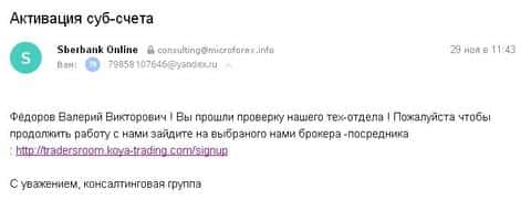 Данная история о лохотроне Koya-Trading изложена подробно, так как жулики очень обидели одного доброго человека. Началось все со звонка Руслана, который якобы предлагал сотрудничать со Сбербанком через "Консультационное управление". Фишка заключалась на дальнейший переход в саму контору Коя Трейдинг, только через несколько левых сайтов. Сначала мошенник зарегистрировал свою жертву на сайте prosto-invest ru, где он ввел все его данные. После пришло клиенту письмо на почту, где указана была ссылка на сайт брокерской кухни Коя Трейдинг, а именно tradersroom.koyatrading com. Мужчина перевел 100 000 рублей и ему зачислили бонусы от типа Сбербанка. Пошла торговля и клиент во всем этом заподозрил мошенничество, так как все сделки торговались в плюс, не доходя до точки закрытия ордера. Человек решил вывести деньги, пока не поздно, но все же платежи по выводу, каким-то образом, осуществлялись через подставную контору microforex info, которая теперь не отвечает на звонки.