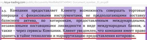 Норма опубликованная далее указывает на то, что компания Koya-Trading является обычной кухонной организацией, не работающей с реальными финансовыми активами. Более того, этот онлайн-лохотрон якобы держит в тайне сведения о поставщиках ликвидности для себя. Что является просто абсурдом.