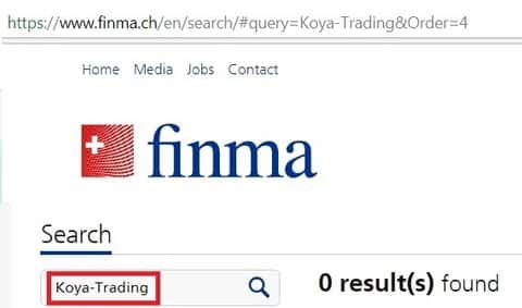 На сайте регулятора из Швейцарии FINMA, жуликов в лице форекс-лохотрона Koya-Trading тоже нет.