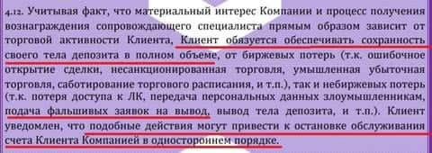 Правило описанное в норме 4.12 клиентского соглашения конторы Коя Трейдинг дает возможность вести мошенническую деятельность против клиентов. Так как пользуясь услугами Koya-Trading вы обязуетесь обеспечивать тело собственного депо и если нарушаете вот такие подставные обязательства - Вас кинут. Собственные средства, которые вложили, а не заработали в процессе игры на Forex, клиент лохотрона Коя Трейдинг не должен трогать.