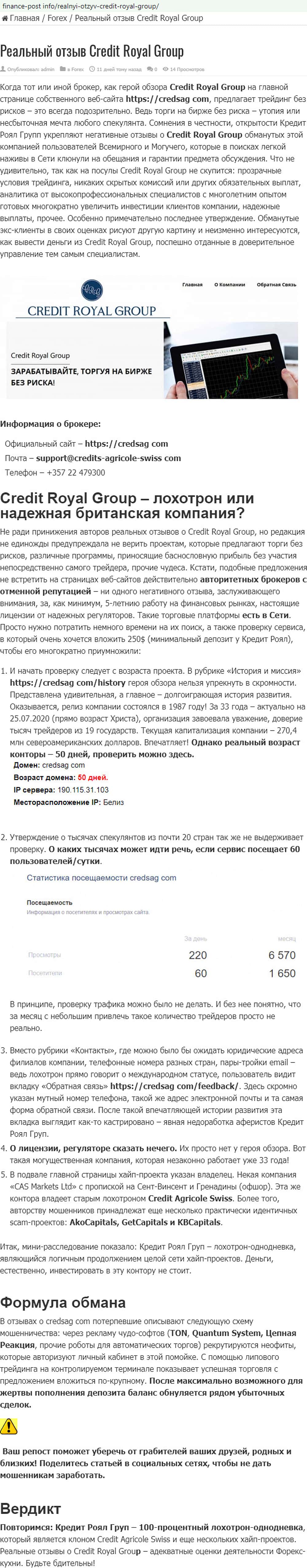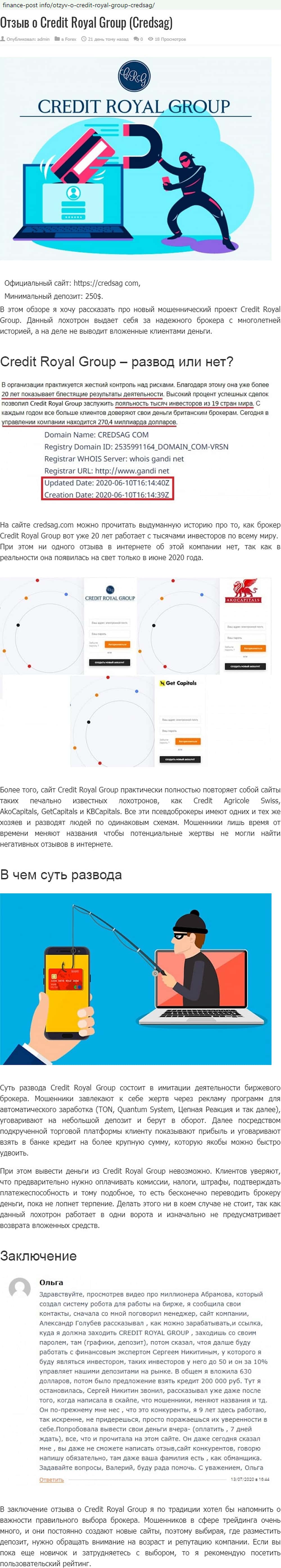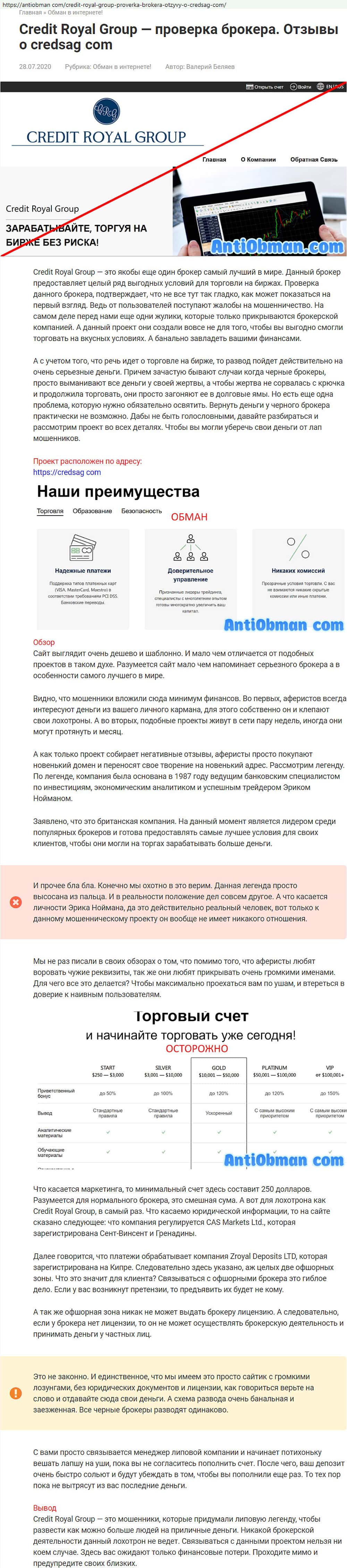 Аферисты Кредит Роял Групп получили негативную статью еще от одного интернет обозревателя, прочтя которую, можно удостовериться в дутости финансового пузыря CredSag.