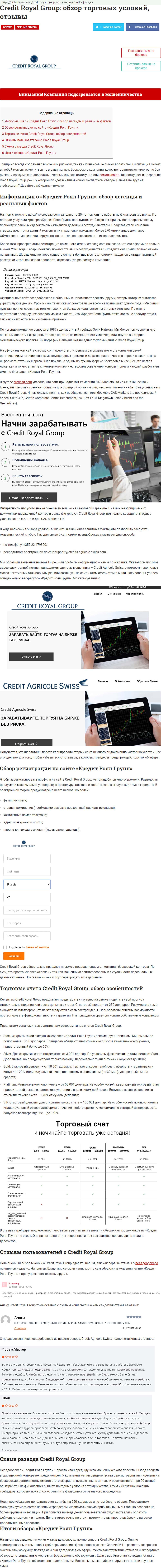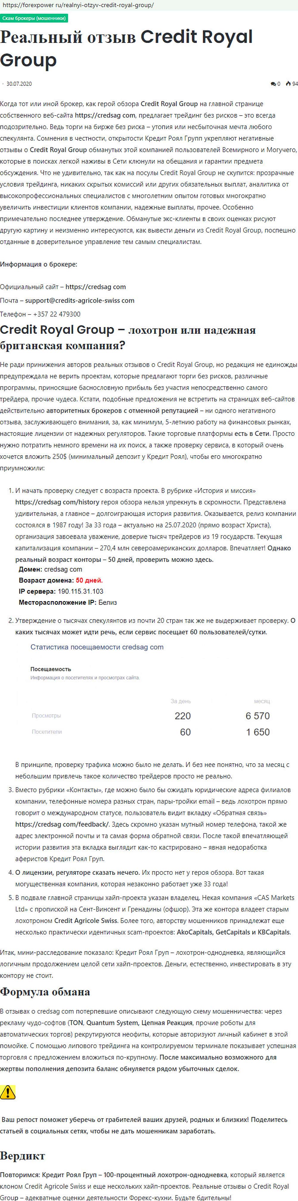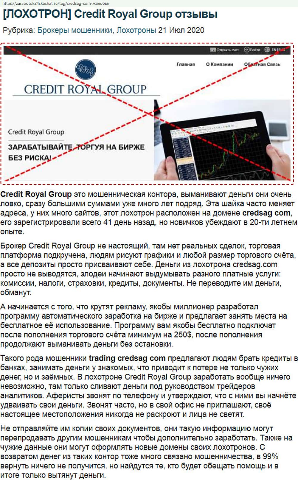 Кредит Роял Групп - мошенники и разводилы! Очередной лохотрон, предназначенный для имитации биржевой торговли с целью выжимания денег из доверчивых людей. Эта шайка жуликов причастна к созданию таких кухонь как KBCapitals, Quantum System, Mono-Trade, АКО Капиталс, Роял Трейдс, Гет Капиталс, Роял Стокс, Аваль Трейд, Амери Трейд, credit-agricole-swiss com, а может и многих еще. Не ведитесь на сладкие обещания разводил CredSag, ни в коем случае не платите им деньги, а еще лучше обходите их десятой дорогой!