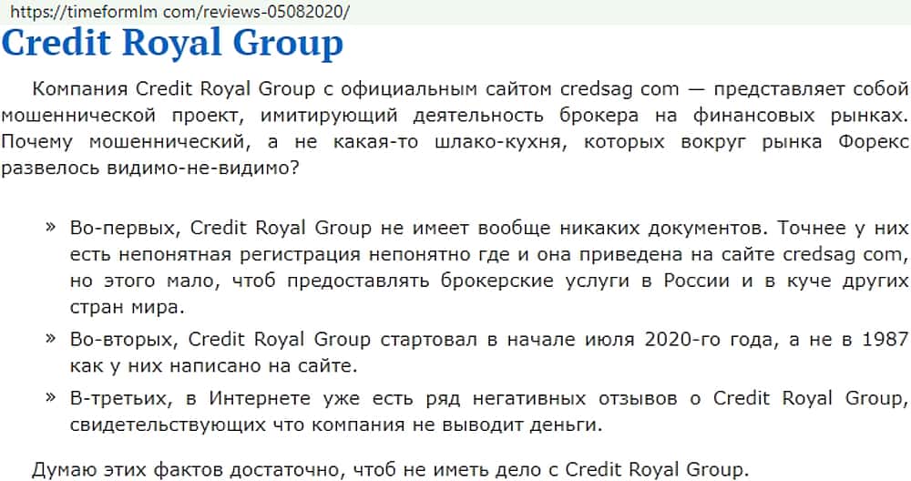 Кратко и по существу описал мошеннический проект Кредит Роял Групп интернет-сайт таймформлм ком. Всего три факта, которые отобьют желание иметь дело с псевдоброкером.