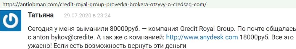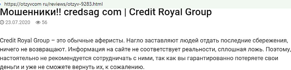 С аферюгами Кредит Роял Групп не рекомендуют иметь дело многие сайты. Мошенники CredSag заставляют людей расстаться с последними сбережениями, не выплачивают деньги.