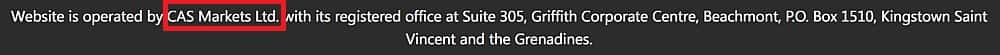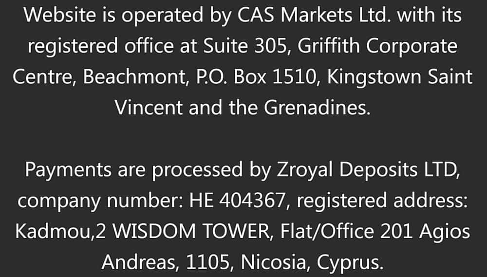 Управляющая лоховозкой Кредит Роял Групп контора CAS Markets Ltd заявляет, что имеет регистрацию и находится в оффшорном государстве Сент-Винсент и Гренадины.