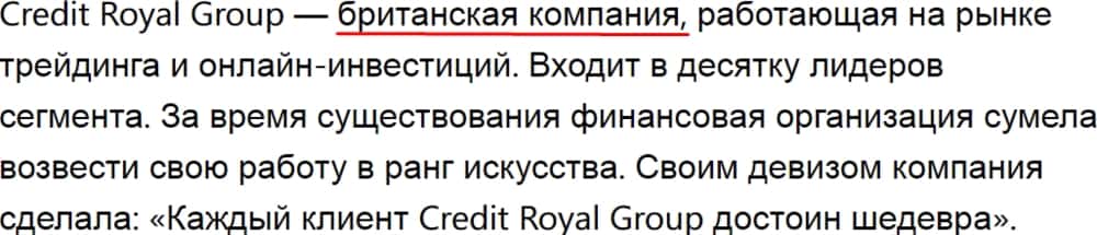 В описании собственного лохопрокатного станка Кредит Роял Групп, мошенники и вовсе утверждают, что являются британской компанией, а следовательно имеют еще один адрес: