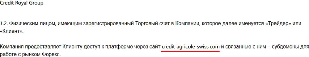 Свое клиентское антисоглашение фарцовщики воздухом Кредит Роял Групп перетащили с предыдущего своего лоходрома, даже не удосужившись переписать название и домен шараги.