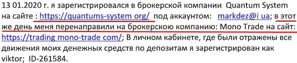 В одной из жалоб, обманутого мошенниками Mono-Trade клиента, можно увидеть, что его к этому недоброкеру перелила другая внебиржевая скам-конторка, называемая Quantum System.