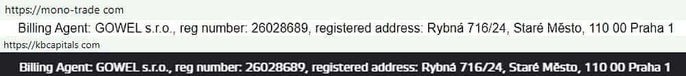Владеет форекс-хайпом Mono-Trade некая организация Gowel s.r.o., которая также является управляющей несколькими нашумевшими лохотронами, в числе которых и кидалы КБ Капиталс.