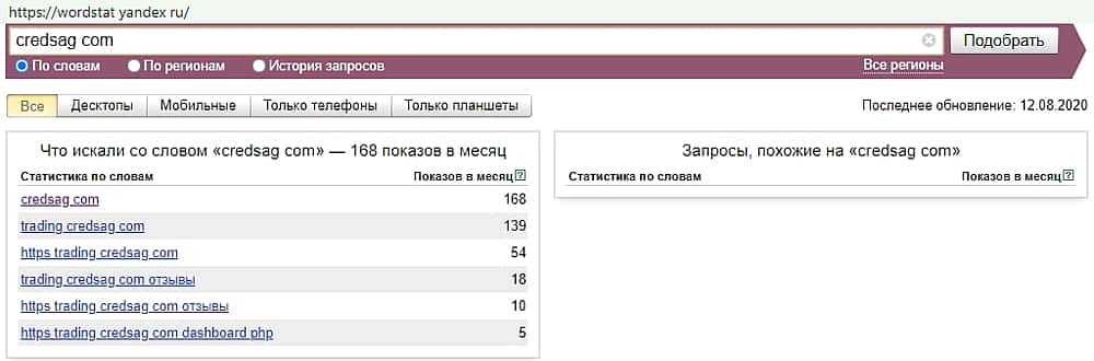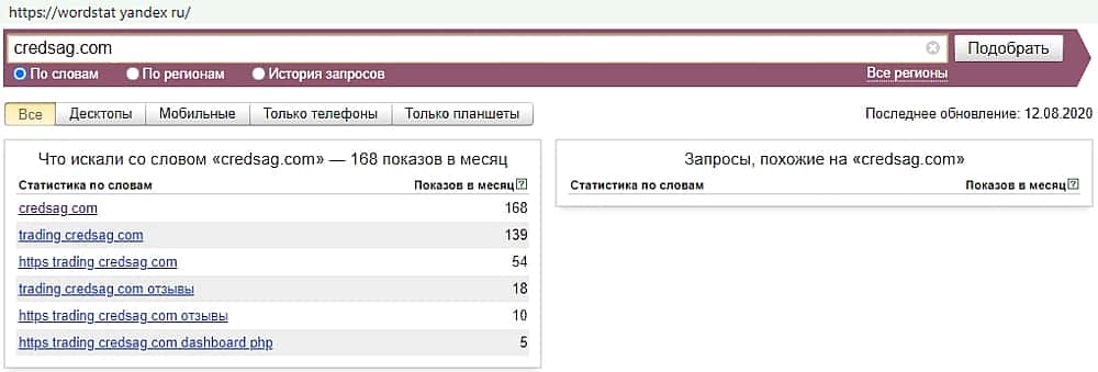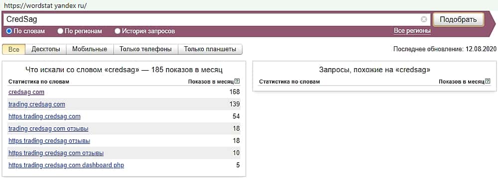 Доменное имя форекс-аферистов "credsag.com" интересовало такое же количество человек, как и предыдущий вариант запроса, что опять-таки говорит не в пользу слов жуликов.