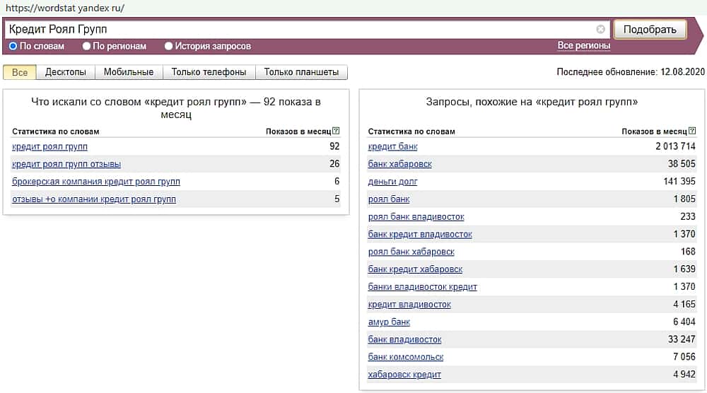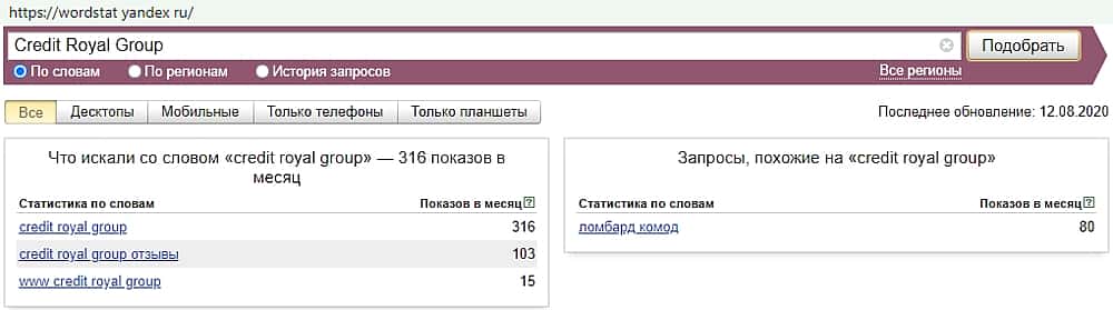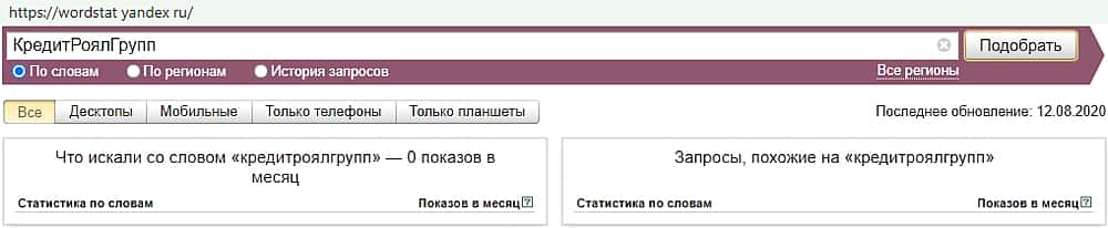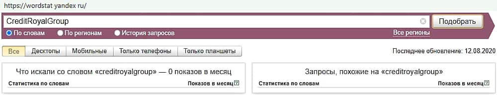 Запрос "КредитРоялГрупп" не принес очков популярности в пользу шарлатанов CredSag. Никому из пользователей поисковика Яндекс не интересно вводить данный бренд в строку.