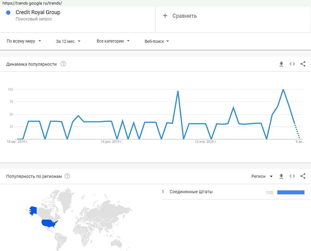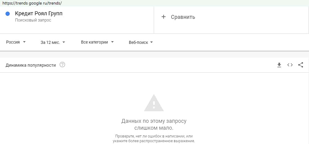Ничуть не лучше обстоят дела с популярностью поискового запроса "КредитРоялГрупп". Его рейтинг среди пользователей веб-сервиса Гугл нулевой, а значит, шансов у мошенников нет.