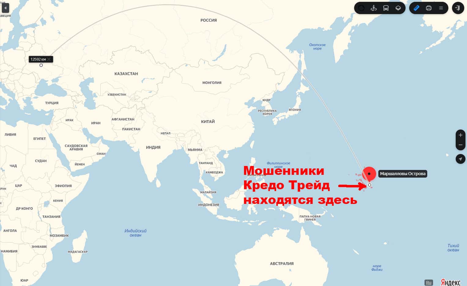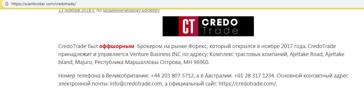 Дополнительным преимуществом для лохотрона Кредо Трейд является факт их оффшорной регистрации, а именно: Ajeltake Road, Ajeltake Island, Majuro, Республика Маршалловы Острова, MH 96960, что дает шулерам Credo Trade анонимность их счетов и соответственно владельцев.